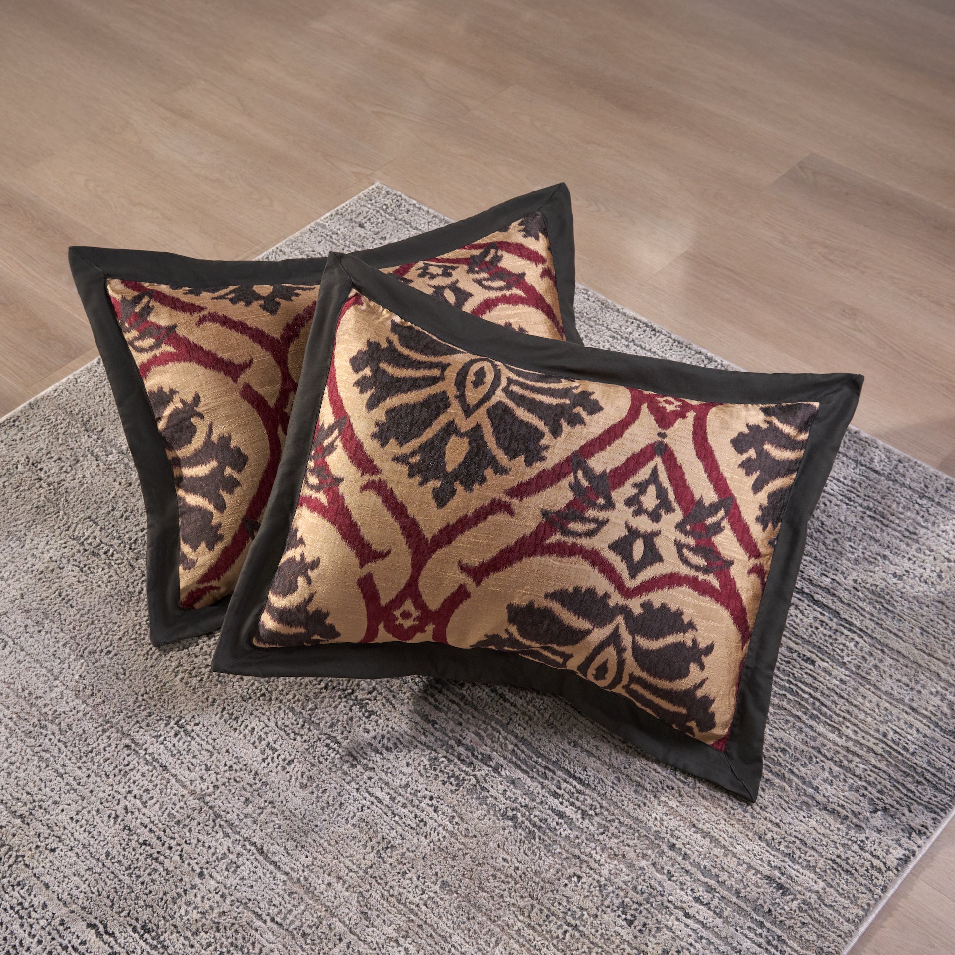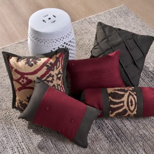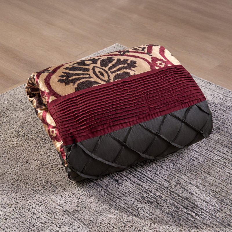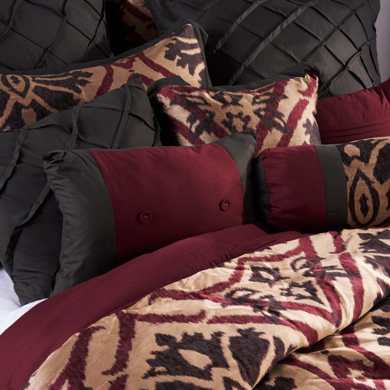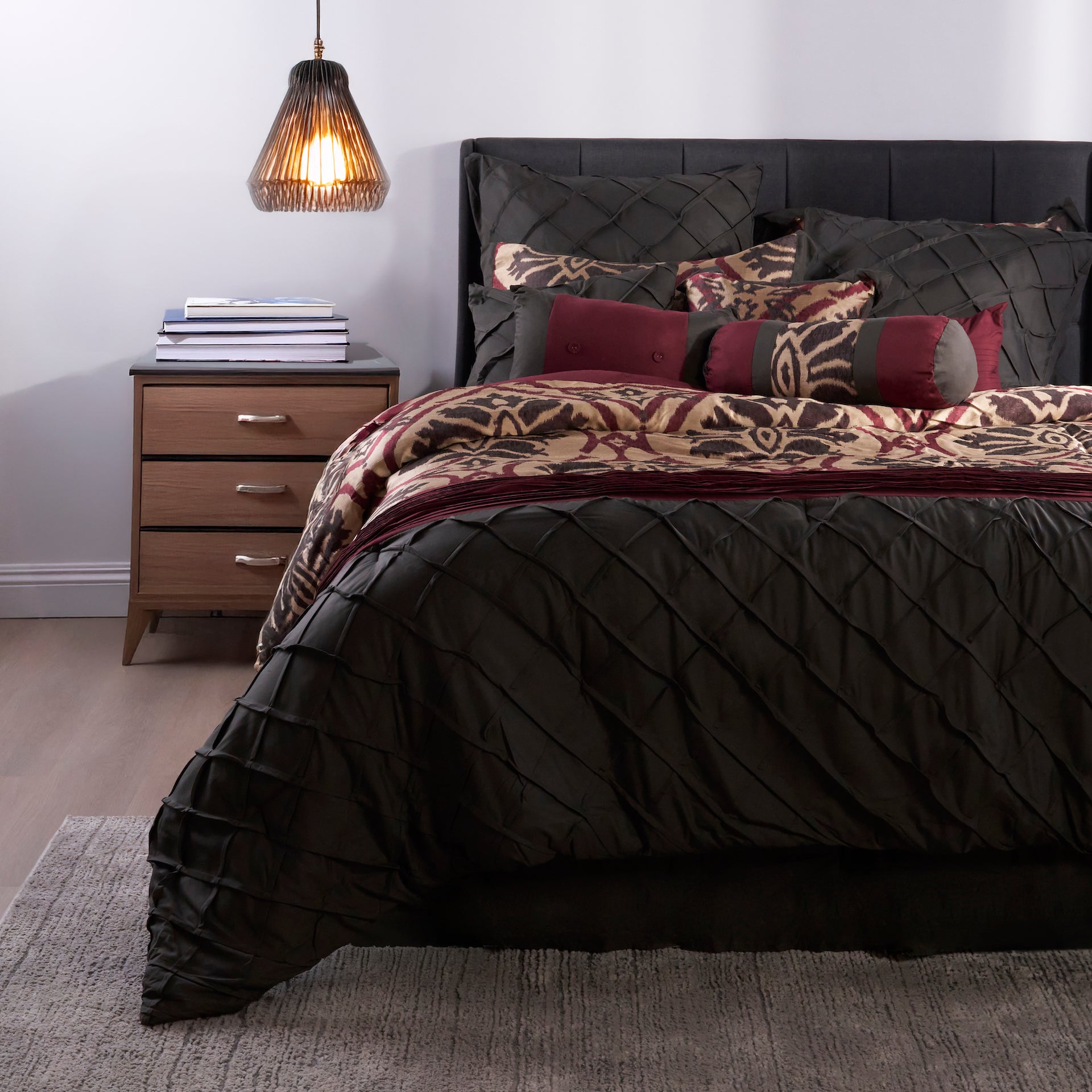 Dress your bed in classic European luxury with our Club Grand Luxury collection. Styled in beloved timeless design, our regal eleven piece collection makes creating a show stopping bed effortless. This decadent collection is rich with the hand crafted details designed to impress. The comforter and two euro shams feature a tailored pleated diamond harlequin pattern in a luscious chocolate brown reversing to a deep shade of cabernet. The comforter is coordinated with a bold over scaled damask print on textured fabric in a rich palette of ivory, chocolate and cabernet. Banded with expanded fourteen additional pleats that reach across the width of the bed, also in stunning cabernet. The damask is mirrored on the two queen shams each adorned with a 2” chocolate flange. There are a total of five luxurious decorative pillows in this collection. Each generously sized and lavishly designed with a mix of more pleating, solid and damask patterned piecing, buttons and tailored flanges. And finally, a custom solid 14’ deep bed skirt in chocolate brown for the perfect foundation. The easy care 100% polyester fabric makes this a breeze to clean. The comforter is machine washable, and the decorative pillows stay beautiful with spot cleaning.