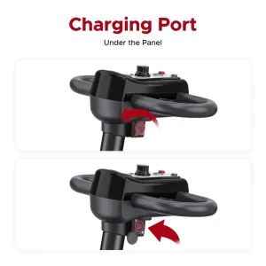 The charging port for this mobility scooter is located at the front of the vehicle. Simply open the rubber cover to charge, as shown in the image above.