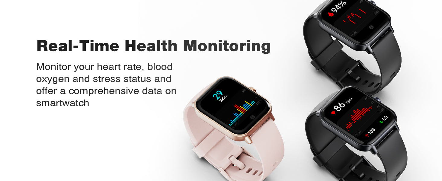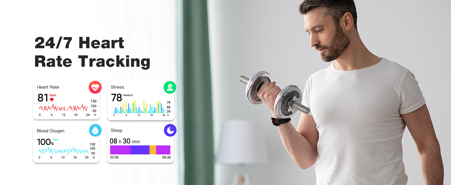 The VeryFit smartwatch features a 1.8” touchscreen for easy access to SpO2, heart rate, steps, calories, sleep, stress, and menstrual tracking, supporting continuous wellness. Customize watch faces to match your style.