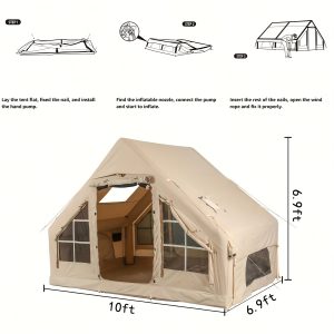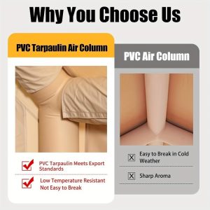 Durable & Weather-Resistant: Made with high-quality Oxford fabric, the canopy of this blow up air tent blocks harmful sunlight and has a waterproof rating of PU2000, keeping you dry during light rain. The windproof pegs and reflective guy ropes ensure security at night. The polyester cotton fabric offers comfort and breathability, preventing overheating. In case of heavy rain, please use the included waterproof canopy.