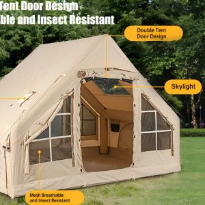 Ventilation & Breathability: This inflatable camping tent features 2 large skylights, offering panoramic views for stargazing. With 2 doors and 4 side windows, it provides excellent ventilation. Mesh screens block dust, while the zippered doors and windows prevent from animals at night. Enjoy fresh air in your blow up tent!