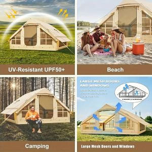 Spacious 129 SQ.FT. Area: The luxury camping tent offers of space(13.12 x 9.84 x 7.22 ft/4 x 3 x 2.2 m ), comfortably accommodating 5-8 people. It’s ideal for family camping, providing room for air mattresses, luggage, and chairs. With a stove jack, it can be used in winter to ensure warmth.