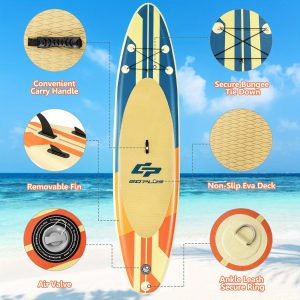Our inflatable stand-up paddle board is ideal for water activities, such as padding, water yoga, fishing and water sunbathing. It can be inflated quickly with the hand pump and deflated with a valve wrench. So you can pack the inflatable sup into a carrying bag with other sup accessories. This board has large bearing capacity due to its premium PVC material and drop-stitch construction, suitable for more people to ride on. Three removable fins control surfing speeds and directions easily. And widened design makes you keep balance and stable standing on it. A safety leash and non-slip deck provide people of all skill levels with safe surfing experience. You may want to stand on it for fishing, and the bungee cords can fix your necessities in order. If you are dreaming of cool water experience in summer, our sup will be a terrific product for you to choose!