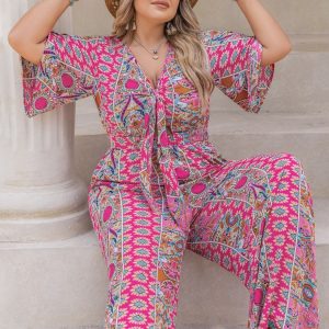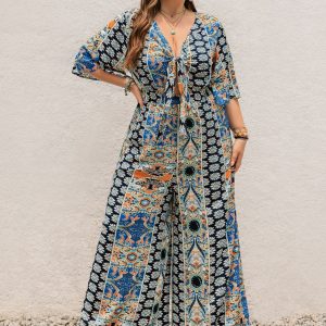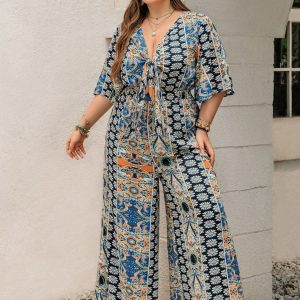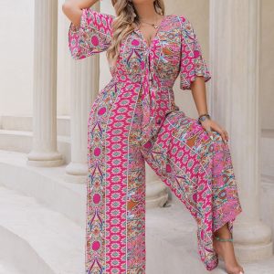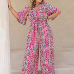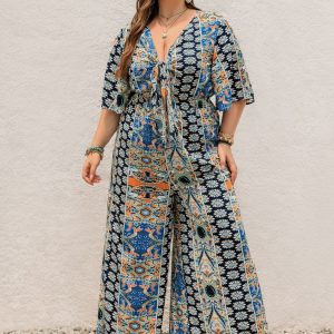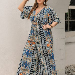 Plus Size Printed Half Sleeve Wide Leg Jumpsuit