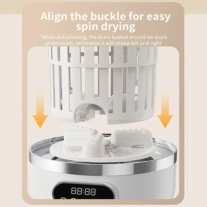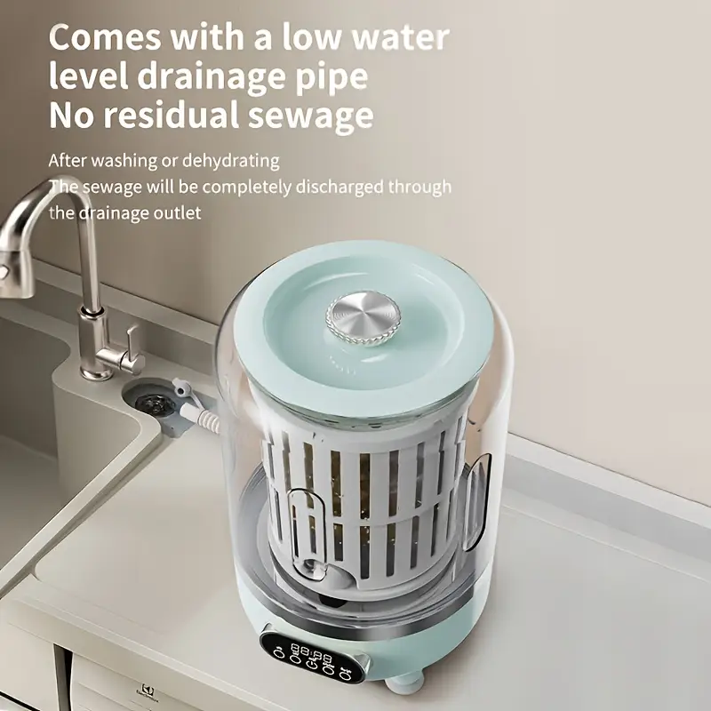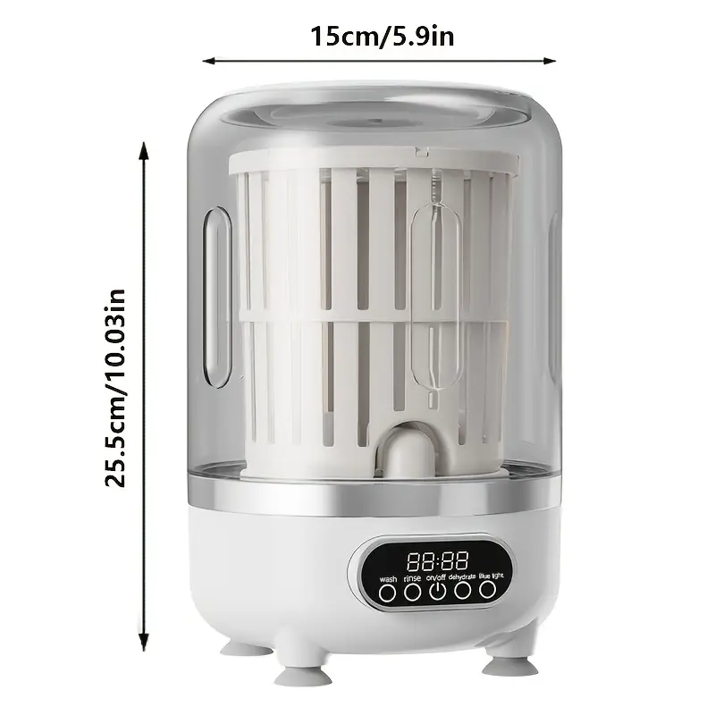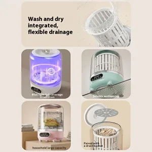 A portable USB-rechargeable mini washing machine with a 4000mAh battery, suitable for travel laundry, specially designed for washing underwear and socks, with an LED display, one-touch operation, and a space-saving design. It is suitable for dormitories, RVs, bathrooms, vertical storage, and is a must-have for dorm rooms. It is made of lightweight and durable plastic.