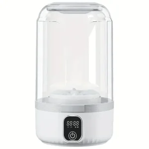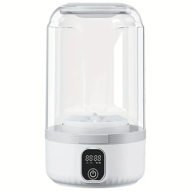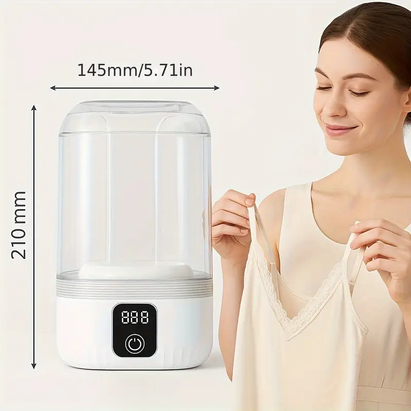 A portable USB-rechargeable mini washing machine with a 4000mAh battery, suitable for travel laundry, specially designed for washing underwear and socks, with an LED display, one-touch operation, and a space-saving design. It is suitable for dormitories, RVs, bathrooms, vertical storage, and is a must-have for dorm rooms. It is made of lightweight and durable plastic.