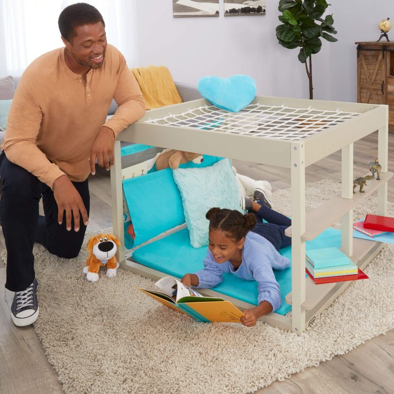 The Little Tikes Read & Dream Nap Nook is a unique reading nook for your child to have a quiet space of their own. The cushioned reading nook pad provides comfort for even the longest reading sessions and has an easy to clean surface. The upper hanging net is a bonus space for relaxing and changing up the view, plus it’s easy to access via the climbing ladder. The stylish fabric wall comes with built in storage for books, magazines, and more.