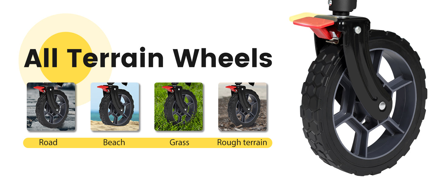 【𝐇𝐢𝐠𝐡𝐞𝐬𝐭 𝐐𝐮𝐚𝐥𝐢𝐭𝐲】:Folding wagon with 𝟳” diameter 𝐛𝐢𝐠 𝐚𝐥𝐥-𝐭𝐞𝐫𝐫𝐚𝐢𝐧 wheels move smoothly for any occasion, such as fishing, camping, shopping, and gardening.The waterproof fabric is 𝟔𝟎𝟎𝐃Oxford which won’t tear when sharp objects are placed inside.