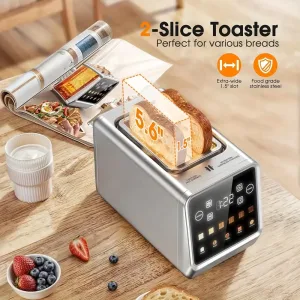 Touchscreen double-slice bread maker, stainless steel smart digital bread maker with memory function, 5 bread types and 6 brightness settings, 1.5-inch double-slice wide slot, 900W, smart bread maker, toaster, fast toasting, breakfast essential, stylish design