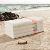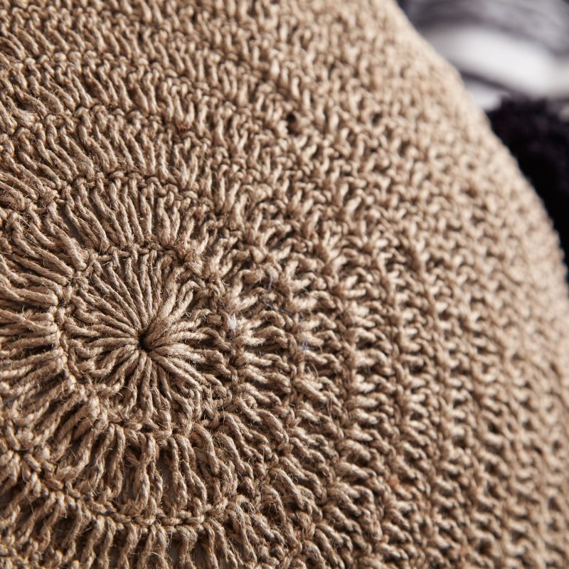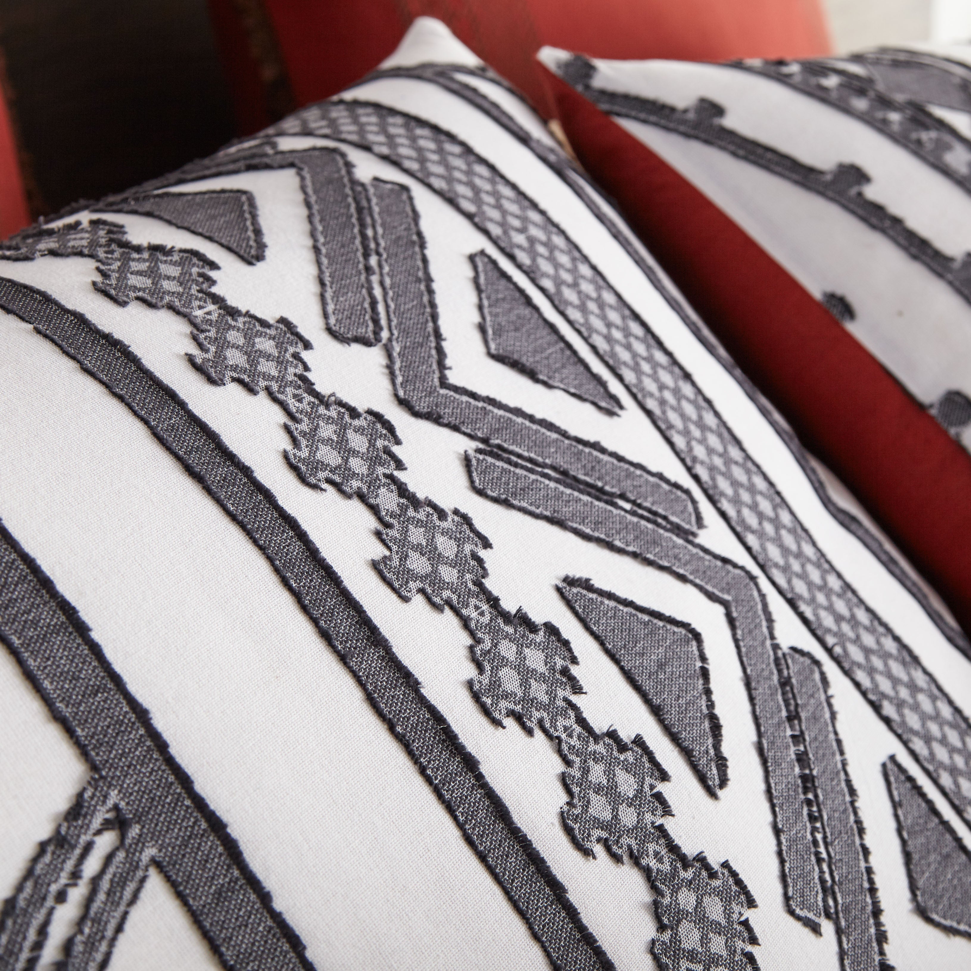 The euros echo the region’s textile artistry featuring banded squares of tribal patterns and brushed fringe. The round dec pillow is hand-woven jute surrounded by black pom poms. The 12” x 18” dec pillow continues the mythic African story with geometric patterns woven in a clip jacquard style, warmed with the shades of a Savanna sunset and finished with a cord piping and four tassels in a rich red-brown.