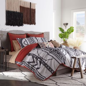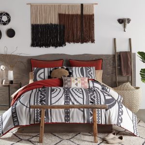 The stunning pattern on the 100% cotton comforter and shams are lifted from the exotic tribal shield chandeliers majestically hanging in the lodge lobby. It features a carefully crafted clip jacquard weave in bold black and white. The contrasting reverse warms the look in a deep earthy red clay textured solid.